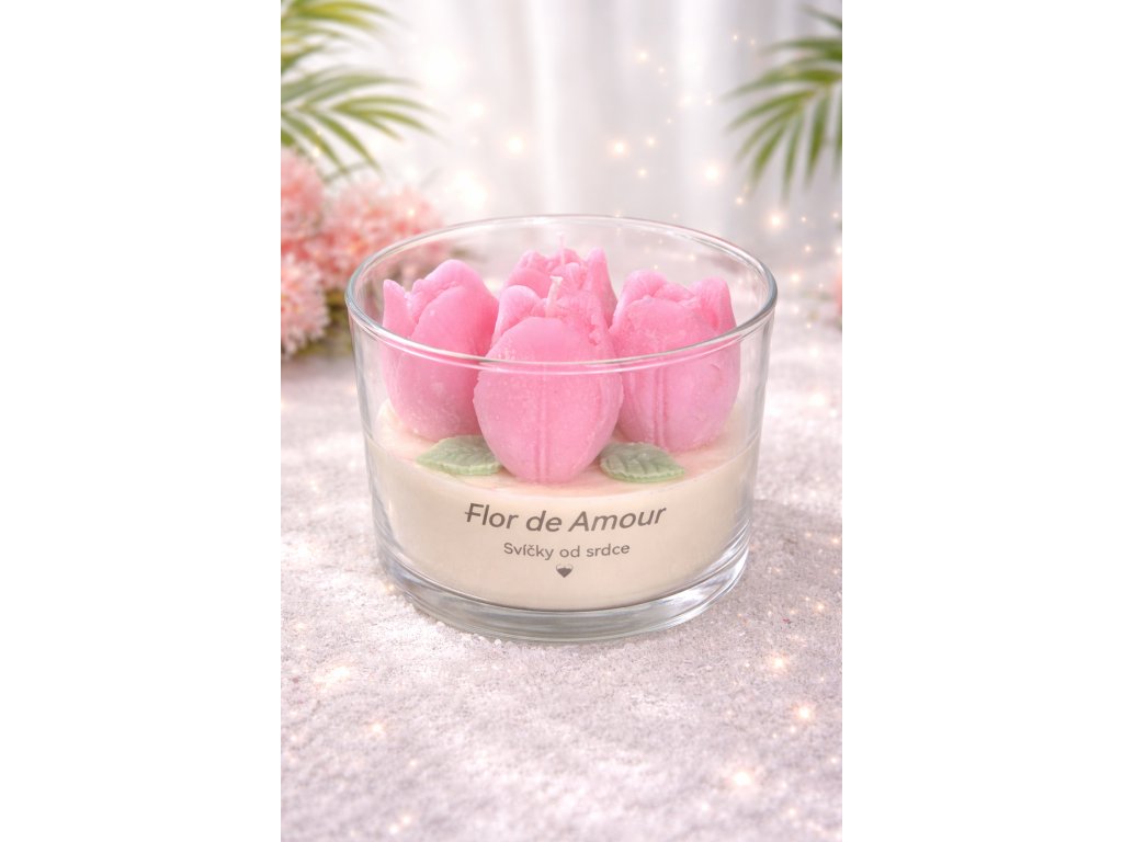 Ručně tvarované růžové květy dodávají svíčce umělecký a luxusní vzhled, zatímco přírodní sójový vosk zajišťuje čisté hoření a dlouhou výdrž.