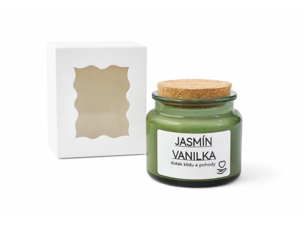 Svíčka je zasazena do stylové skleněné dózy s korkovým víčkem, které podtrhuje její minimalistický a přírodní vzhled. Vůně jasmínu přináší pocit uvolnění, zatímco vanilka dodává sladký, hřejivý podtón – společně vytvářejí dokonalou atmosféru pro chvíle odpočinku.