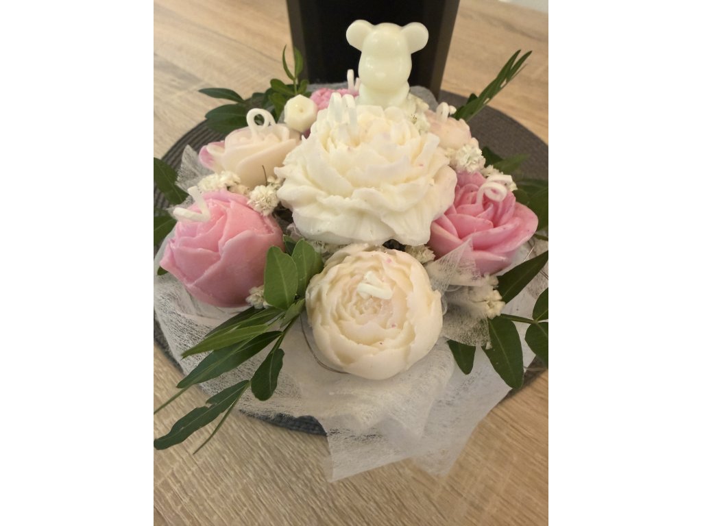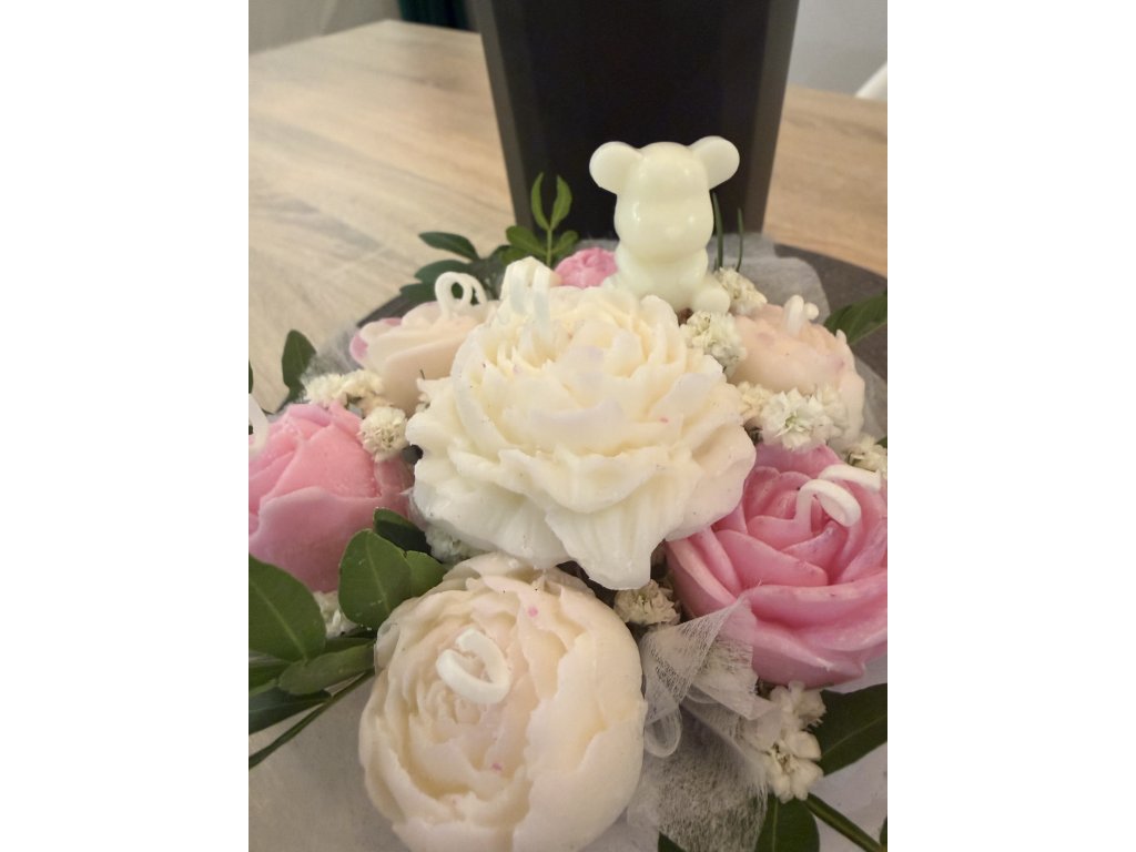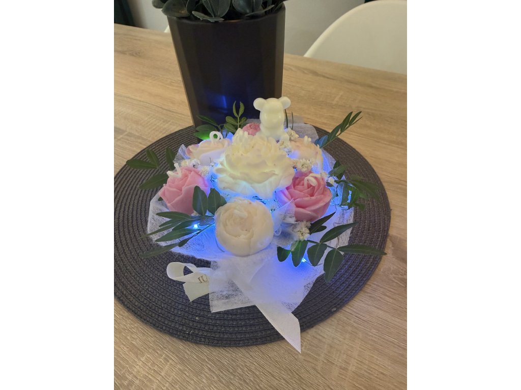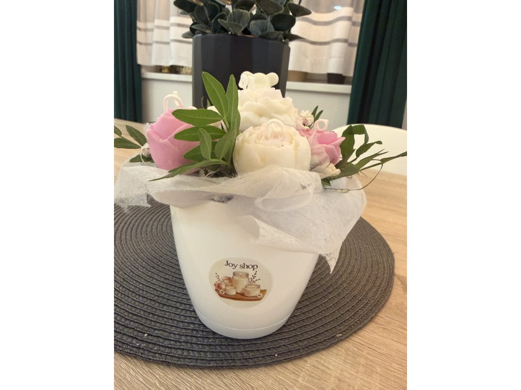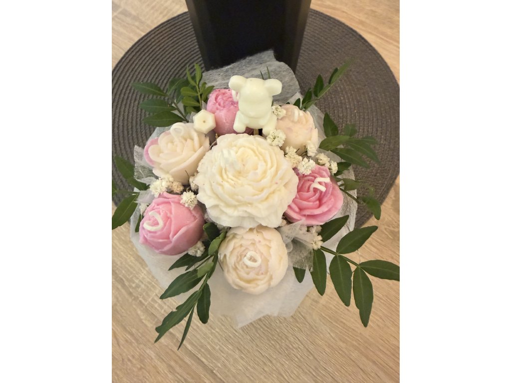 Tato ručně vyráběná kytice ze 100% sojového vosku je dokonalým spojením elegance a originality. Jemné květy v krémových a růžových tónech vypadají jako živé, ale místo vody voní – a vydrží mnohem déle než klasické květiny.