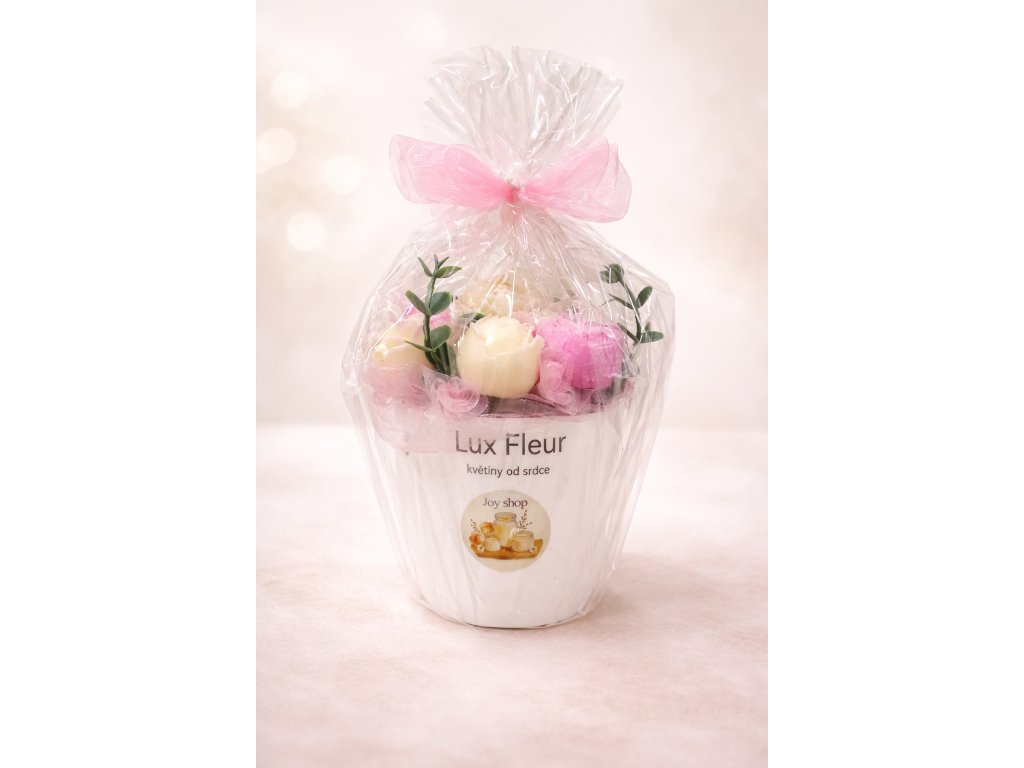 Elegantní dárková dekorace Lux Fleur – květiny od srdce je něžný a vkusný dárek, který potěší při každé příležitosti. Kombinuje svíčky ,jemné květy ze sojového vosku v pastelových odstínech, dekorativní zeleň a stylový bílý obal s decentním designem.
