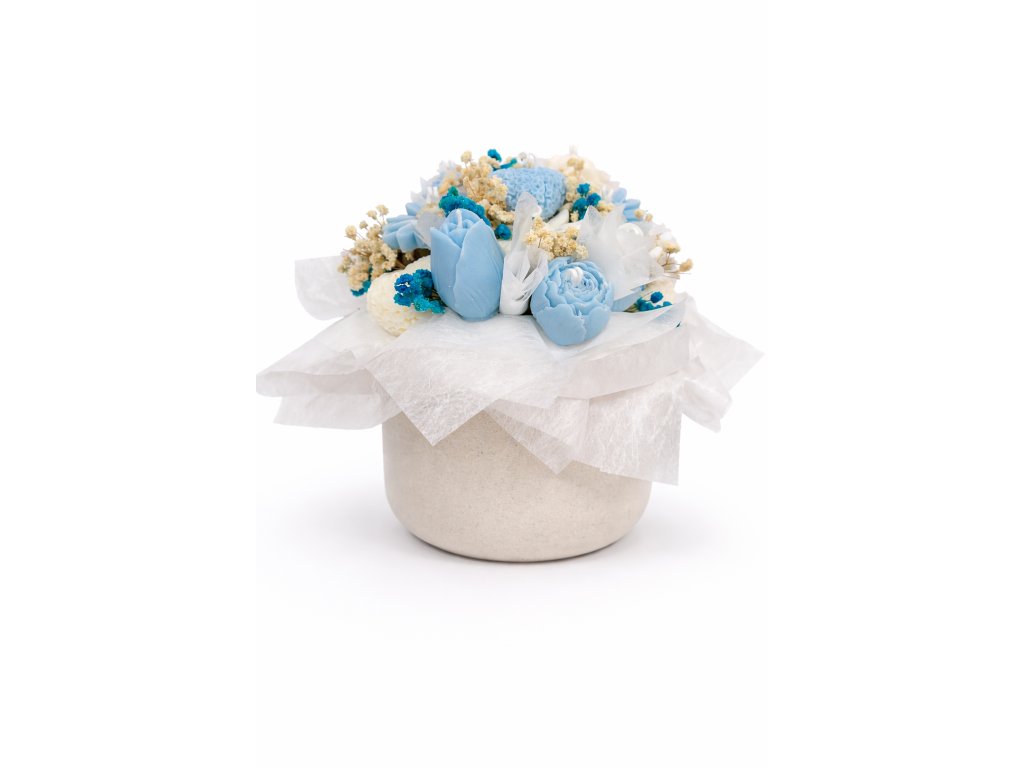 Celá kompozice je umístěna v kvalitním keramickém květináčku, který dodává výrobku luxusní a stylový vzhled. Díky tomu je květina nejen svíčkou, ale také krásnou dekorací do interiéru.