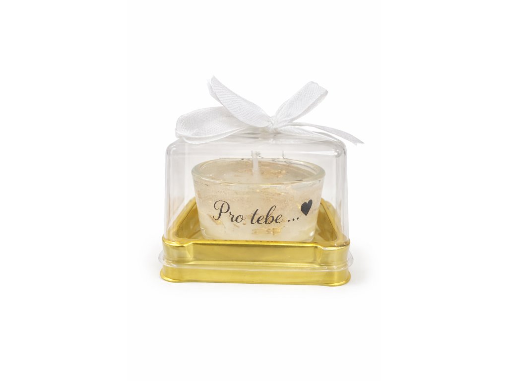 Malý dárek, který řekne víc než slova. Elegantní čajová svíčka z gelového vosku se zlatými dekorativními komponenty je krásným symbolem pozornosti a radosti pro někoho blízkého. Nápis „Pro tebe…“ se srdíčkem dodává svíčce osobní a milý charakter.